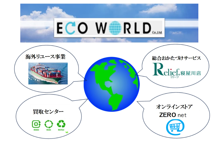 エコワールドは、中古家具や雑貨等を輸出する「海外リユース事業」、遺品整理を中心とした「総合お片付けサービス」、様々な商品を取り扱う「買取センター」、ネットオークションとしての「オンラインストアZEROnet」の4事業を展開しています。